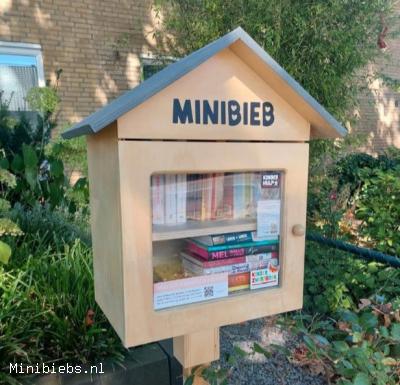 Minibieb gewonnen bij een winactie van Openbare Bibliotheek Gelderland Zuid (OBGZ) en gemaakt door Houtgenoten. De onderste plank van de bieb is gereserveerd voor kinderboeken. Op de bovenste plank staan boeken voor volwassenen.