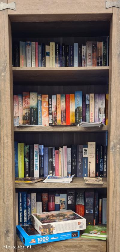 Binnen in de winkel een ruime kast met een royaal en gevarieerd aanbod boeken, dat bovendien snel wisselt.